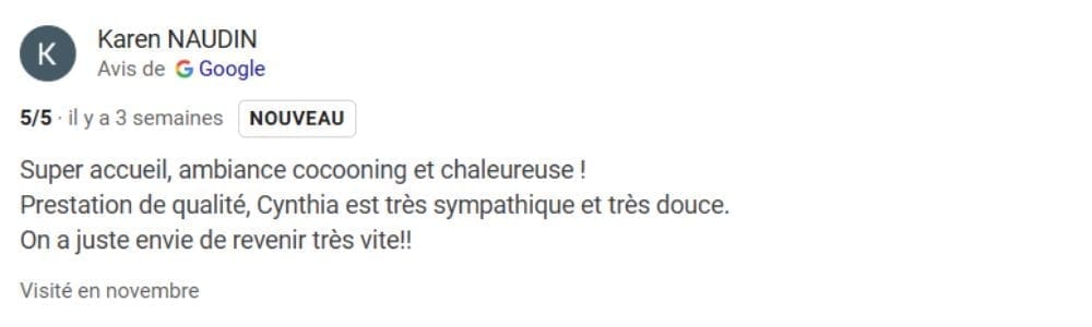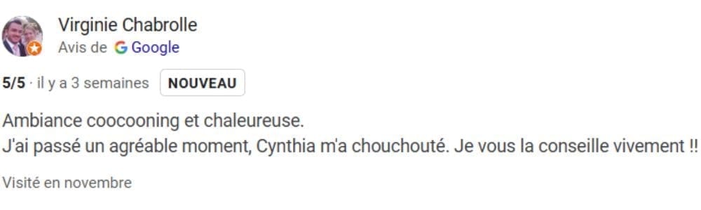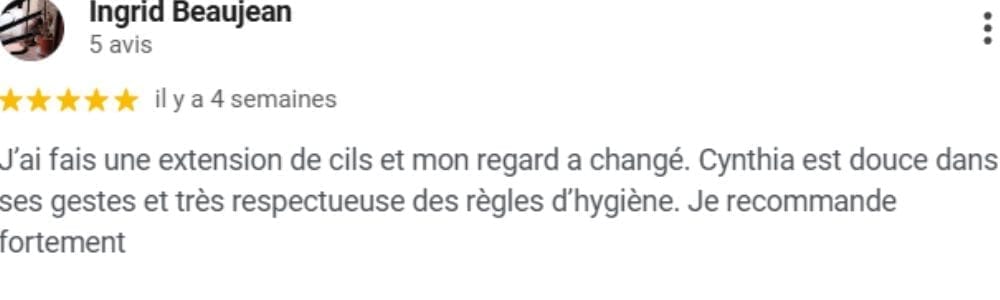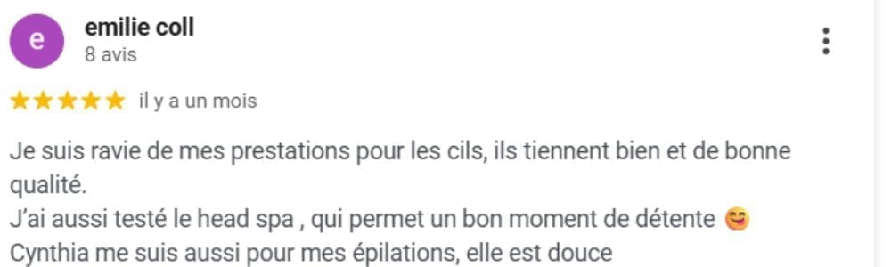 "Je suis venue pour les cils, je suis repartie avec 2h de sommeil en plus et un regard de biche. Mon mari croit que j'ai fait une cure de vitamines !" — Émilie C., Sénas